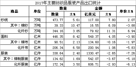 從具體出口商品看,除化纖紗出口價(jià)格回升外,其他價(jià)格均不同程度回落。2017年紗線出口數(shù)量473.77萬(wàn)噸,同比增長(zhǎng)5.6%,出口金額增長(zhǎng)7.8%,平均單價(jià)上升2.1%,其中棉紗線數(shù)量增長(zhǎng)10.5%,金額增長(zhǎng)6.1%,平均單價(jià)下滑3.9%。面料出口數(shù)量446.35億米,同比增長(zhǎng)8.4%,出口金額微增4.1%,平均單價(jià)下跌3.9%,其中棉布數(shù)量增長(zhǎng)2.1%,金額下降0.2%,平均單價(jià)下跌1.97%。棉及化纖服裝出口數(shù)量338.64億件,同比增長(zhǎng)2.4%,出口金額下降2.6%,平均單價(jià)下跌7.3%,其中棉制服裝數(shù)量增長(zhǎng)1.7%,平均單價(jià)下跌5.2%,化纖服裝數(shù)量增長(zhǎng)3.5%,平均單價(jià)下跌6.1%。附表:2017年主要產(chǎn)品出口統(tǒng)計(jì)