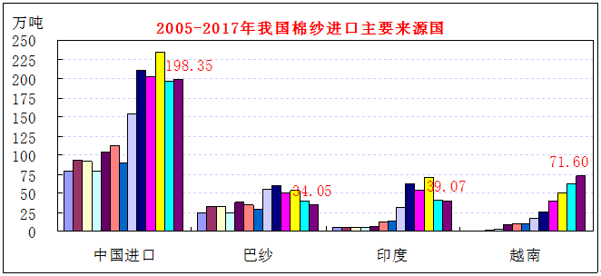 受國(guó)際棉價(jià)起起落落和中國(guó)棉市持續(xù)平穩(wěn)等因素影響,棉紗線進(jìn)口激增現(xiàn)象受到抑制,進(jìn)口總量基本維持上年水平,但自越南進(jìn)口激增現(xiàn)象依舊突出。據(jù)中國(guó)海關(guān)統(tǒng)計(jì),2017年我國(guó)棉紗線進(jìn)口數(shù)量198.35萬(wàn)噸,較上年微增0.6%,進(jìn)口金額增長(zhǎng)6.5%,進(jìn)口單價(jià)上漲6.8%。在主要進(jìn)口國(guó)別中,來(lái)自于印度、巴基斯坦的進(jìn)口數(shù)量分別下降6.1%、12.5%,但自越南進(jìn)口仍十分強(qiáng)勁。2017年自越南進(jìn)口棉紗線71.59萬(wàn)噸,同比增長(zhǎng)14.5%,占我國(guó)棉紗線進(jìn)口總量的31.5%,占越南紗線出口總量的53.1%,即越南出口紗線中的一半以上面向中國(guó)市場(chǎng)。