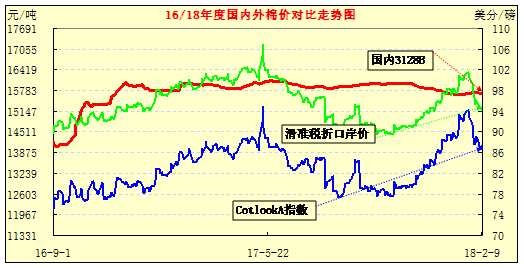 由于直補(bǔ)和輪儲(chǔ)兩項(xiàng)基本政策保駕護(hù)航,近兩年來(lái)國(guó)內(nèi)棉市基本不受任何外圍市場(chǎng)影響而獨(dú)自走自己平穩(wěn)運(yùn)行行情。2017年國(guó)際棉市在過(guò)渡炒作情況下,棉價(jià)起起落落,兩度沖高近年來(lái)最高水平,尤其是從2017年8月-2018年1月中旬,受炒作及中國(guó)擴(kuò)大棉花進(jìn)口(2017年中國(guó)進(jìn)口棉花115.3萬(wàn)噸,同比增長(zhǎng)28.9%,扭轉(zhuǎn)連續(xù)4年大幅下滑局面),棉價(jià)持續(xù)攀高,紐約期棉由平均68美分/磅攀升到83美分/磅,累計(jì)上漲達(dá)1500點(diǎn),漲幅22%;CotlookA指數(shù)上漲1700點(diǎn)至94美分/磅近幾年高位。受國(guó)際棉價(jià)大起大落杠桿影響,內(nèi)外棉價(jià)差由最高3000元/噸左右縮小到300元/噸以內(nèi),滑準(zhǔn)稅折口岸價(jià)甚至高于國(guó)內(nèi)棉價(jià)。國(guó)際棉價(jià)極不穩(wěn)定和內(nèi)外棉價(jià)價(jià)差倒掛,為增強(qiáng)國(guó)產(chǎn)紗競(jìng)爭(zhēng)力打下堅(jiān)實(shí)基礎(chǔ),也是棉紗進(jìn)口激增縮水重要因素之一。附圖:內(nèi)外棉價(jià)對(duì)比走勢(shì)