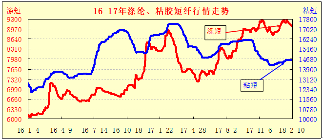 主要化纖價(jià)格則不如棉價(jià)穩(wěn)定,受成本、環(huán)保、需求等因素影響,滌綸短纖價(jià)格持續(xù)攀高,粘膠短纖高位回落。其中滌綸短纖受原油價(jià)格急速回升(由不足30美元/桶升到60美元/桶左右),2017年價(jià)格持續(xù)攀高,主體價(jià)由7300元/噸一路攀升到9200元/噸左右,累計(jì)上漲近2000元/噸,漲幅達(dá)25.6%,這也是滌綸行業(yè)效益大幅提升重要因素之一。粘膠短纖受后加工企業(yè)需求不力,價(jià)格高位回落,目前維穩(wěn)14500元/噸左右。