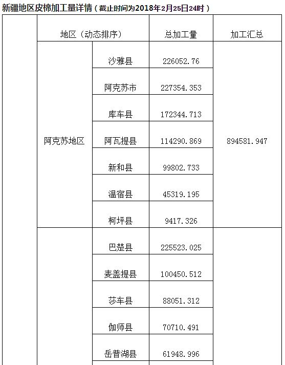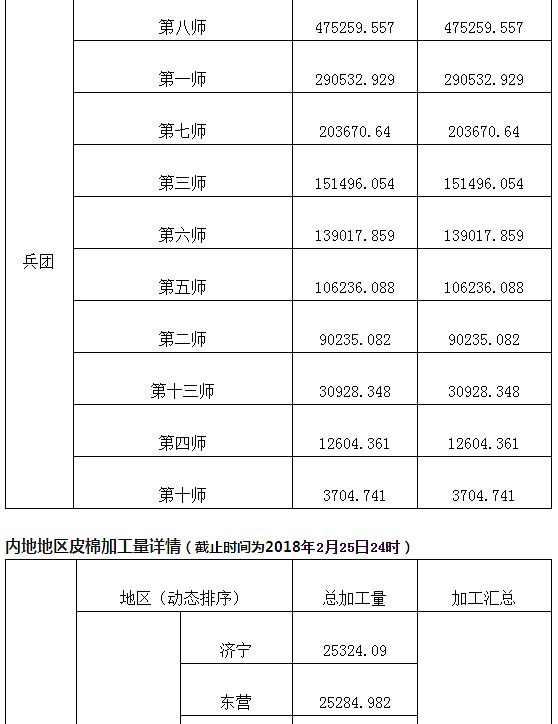 截至2018年2月25日24點,統(tǒng)計400型加工企業(yè)皮棉加工情況: