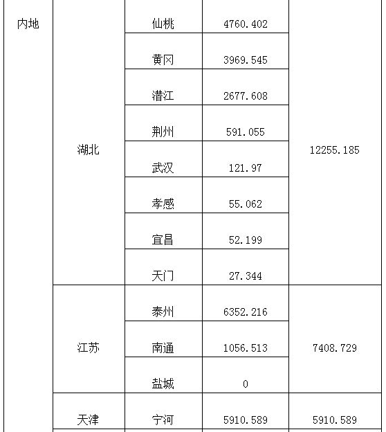 內(nèi)地累計加217498.726噸;山東企業(yè)108487.277噸,河北企業(yè)43262.508噸,甘肅企業(yè)38123.536噸,湖北企業(yè)12255.185噸,江蘇企業(yè)7408.729噸,天津企業(yè)5910.589噸,安徽企業(yè)1280.943噸,湖南企業(yè)319.264噸。