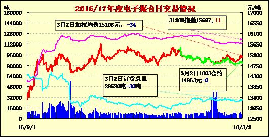 2日電子撮合交易成交量增加,合同均價多數(shù)收跌。其中MA1807成交量較大,為1990噸;活躍交投的合同多集中于遠期合同,其中MA1807訂貨量最大,累計訂貨量為7380噸。截止22日一周美棉累計簽約出口棉花9.47萬噸,裝運6.6萬噸,偏低的裝運進度抵消了出口數(shù)據(jù)帶來的利好,同時市場擔(dān)憂由于美國對進口鋼鐵和鋁征收關(guān)稅影響棉花出口,隔夜ICE期棉在經(jīng)歷持續(xù)大幅上漲后大幅回調(diào),主力5月合約盤中最低至80.67美分/磅,尾盤收復(fù)部分失地,但全天依然收跌1.12美分至81.81美分/磅,期價挑戰(zhàn)84美分/磅強壓力位失敗,短期可能繼續(xù)回調(diào)。