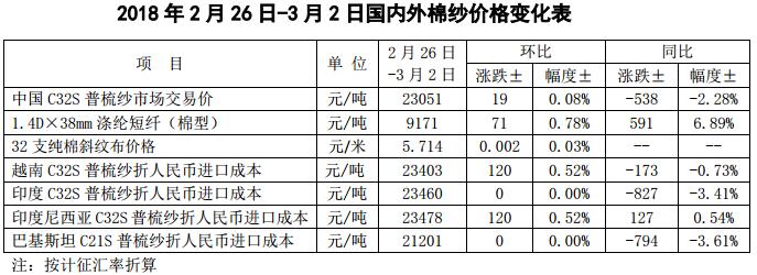 本周國內(nèi)紡企訂單小量增加,棉紗價格延續(xù)小幅上漲;外紗價格隨國際棉價繼續(xù)上漲;國內(nèi)坯布陸續(xù)啟動,純棉布價格出現(xiàn)上漲跡象;滌綸短纖價格隨原料PTA走勢回升。