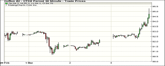 5日紐約期棉全面收漲。近月1803合約結(jié)算價85.41美分,漲269點(diǎn);1805合約結(jié)算價85.23美分,漲314點(diǎn);1807合約結(jié)算價84.98美分,漲263點(diǎn);1812合約結(jié)算價77.95美分,漲90點(diǎn)。2019年度合約上漲43-85點(diǎn)不等。當(dāng)日5月合約高開后繼續(xù)走強(qiáng),在買盤強(qiáng)有力的支撐下交易重心不斷走高,最高觸及85.30美分(+321點(diǎn)),創(chuàng)下該合約歷史最高點(diǎn),后賣盤在高點(diǎn)入場期價小幅回落,最終結(jié)算價創(chuàng)該合約歷史最高,以大漲收盤。外圍美元指數(shù)上漲,玉米、大豆和小麥期貨上漲。