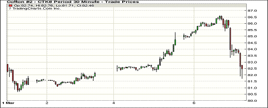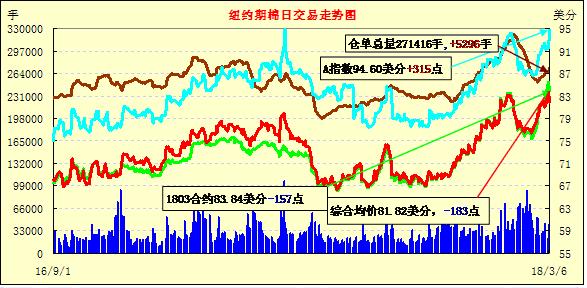 6日紐約期棉近跌遠漲。近月1803合約結算價83.84美分,跌157點;1805合約結算價82.43美分,跌280點;1807合約結算價82.49美分,跌249點;1812合約結算價77.95美分,跌111點。2019年度合約上漲7-19點不等。當日5月合約小幅低開,在買盤支撐下交易重心上行突破86美分,圍繞86美分一線波動運行,最高觸及86.60美分創(chuàng)該合約新高點,后賣盤在高點入場期價承壓出現(xiàn)斷崖式下跌,后在83.5-84.00美分區(qū)間波動,試圖穩(wěn)定在83.5美分一線失敗繼續(xù)掉頭向下,最終以大跌收盤,幾乎吐盡昨日漲幅。分析師指出,由于本周主力合約屢屢創(chuàng)下價格高點,棉花市場處于超買狀態(tài)。外圍美元指數(shù)下跌,玉米期貨上漲,大豆和小麥期貨下跌。
