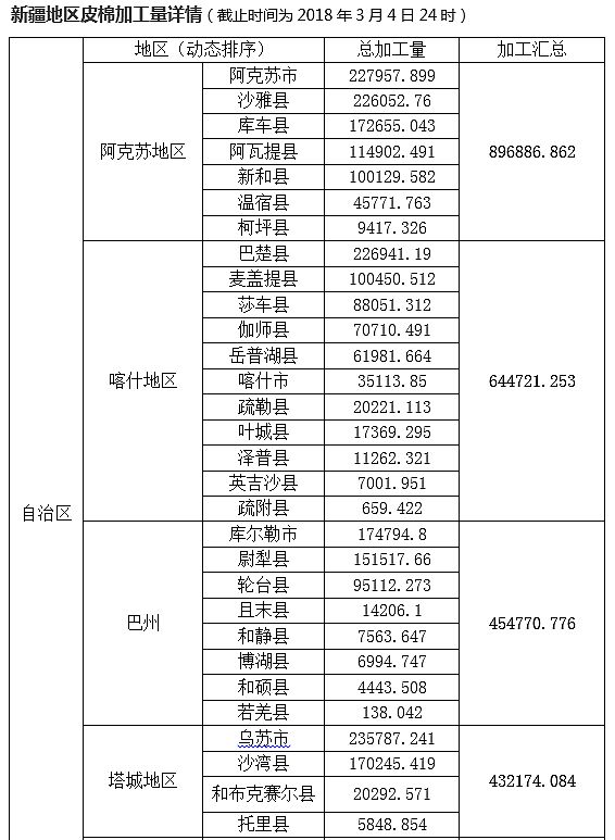 截至2018年3月4日24點(diǎn),統(tǒng)計(jì)400型加工企業(yè)皮棉加工情況: