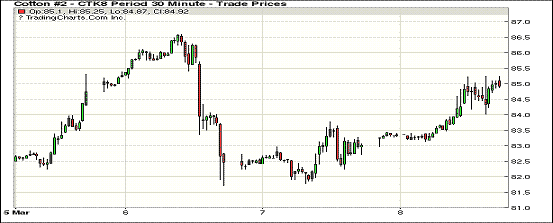 8日紐約期棉市場全面收漲,1805合約結(jié)算價85.12美分,漲226點;1807合約結(jié)算價84.55美分,漲200點;1812合約結(jié)算價78.49美分,漲44點;1903合約結(jié)算價78.34美分,漲23點。2019年度其他合約上漲3-22點不等。當(dāng)日5月合約高開后穩(wěn)定在83-83.5美分之間波動,后買盤入場交易重心受支撐上行突破85美分,在USDA供需月報發(fā)布后,產(chǎn)量預(yù)期和期末庫存略有調(diào)減,市場應(yīng)聲小幅下行,在84美分處獲買盤支持反彈走高,最終大幅收漲。據(jù)美國農(nóng)業(yè)部(USDA),2.22-3.1日一周美國凈簽約出口2017/18年度陸地棉87067噸,較前一周增加31%,較近4周平均簽約量增加5%;裝運2017/18年度陸地棉118886噸,創(chuàng)本年度高點,較前一周增加88%,較近4周平均增加53%。外圍美元指數(shù)上漲,玉米和小麥期貨上漲,大豆期貨下跌。