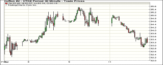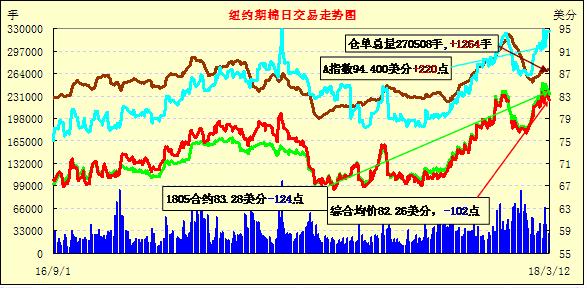 12日紐約期棉市場近跌遠(yuǎn)漲,1805合約結(jié)算價83.28美分,跌124點;1807合約結(jié)算價83.21美分,跌98點;1812合約結(jié)算價78.72美分,不變;1903合約結(jié)算價78.83美分,漲3點。其他合約上漲6-10點不等。當(dāng)日5月合約小幅低開,整日交易重心向下,開盤后因賣盤打壓市場下行,跌至84.5美分處尋找支撐,但因賣盤壓力過重重心繼續(xù)向下,后跌破83.5美分后買盤入場,市場受支撐短暫反彈,但因上漲動力不足掉頭向下,跌幅加深,最終收于近低點。外圍美元指數(shù)下跌,玉米期貨不變,小麥和大豆期貨上漲。
