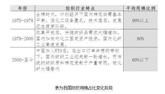 從細(xì)處看化纖替代棉花主要有兩方面原因。一、對(duì)紡織產(chǎn)品要求更加多樣化,化纖原料可以彌補(bǔ)棉花產(chǎn)品特性上的不足。二、可紡化纖具有價(jià)格優(yōu)勢(shì)。2005年以前用棉比例下降主要出于第一個(gè)原因。滌綸等化纖具備良好的力學(xué)性能、耐熱性和色牢度,密度小、織物輕、彈性好、耐疲勞破壞等優(yōu)點(diǎn),雖不具備棉花吸濕親膚、柔軟的特性,卻彌補(bǔ)棉花易褪色和變形等劣勢(shì)。