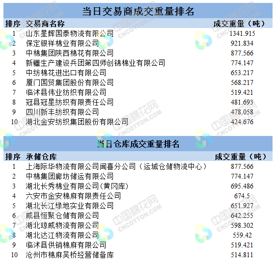 成交價格:最高成交價15740元/噸,新疆棉,平均長度28.94mm,重量173.124噸,承儲單位連云港新蘇豫棉花儲運有限公司;最低成交價13050元/噸,地產(chǎn)棉,平均長度27.2mm,重量135.131噸,承儲單位襄陽銀基棉業(yè)有限公司;最高加價2380元/噸,新疆棉,平均長度28.94mm,重量173.124噸,承儲單位連云港新蘇豫棉花儲運有限公司。