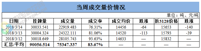 累計情況:截至3月14日,累計計劃出庫9.01萬噸,累計出庫成交7.53萬噸,成交率83.69%;成交平均價14536元/噸,折3128價格15759元/噸,成交最高價16790元/噸,最低價11990元/噸。