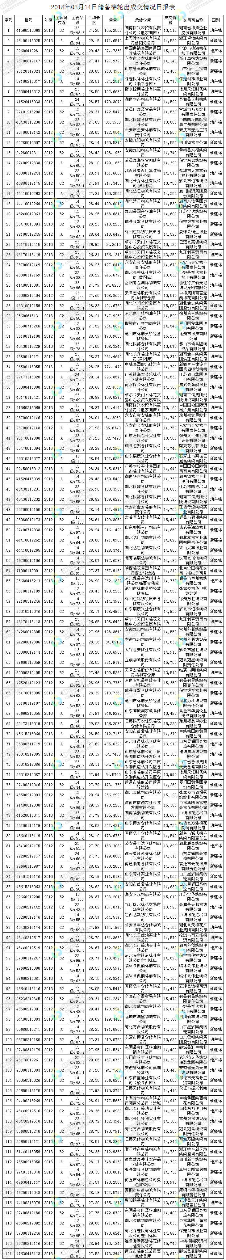3月14日儲備棉輪出銷售資源30033.541噸,實際成交22919.483噸,成交率76.31%。平均成交價14456元/噸(較前一日下跌64元/噸);折3128價格15653元/噸(較前一日下跌140元/噸)。