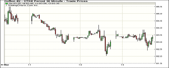 14日紐約期棉市場近漲遠(yuǎn)跌,1805合約結(jié)算價(jià)83.44美分,漲46點(diǎn);1807合約結(jié)算價(jià)83.20美分,漲34點(diǎn);1812合約結(jié)算價(jià)78.02美分,跌47點(diǎn);1903合約結(jié)算價(jià)78.20美分,跌47點(diǎn)。其他合約下跌14-42點(diǎn)不等。當(dāng)日5月合約小幅高開,開盤后交易中心呈窄幅震蕩趨勢運(yùn)行,上行至當(dāng)日高點(diǎn)83.87美分處賣盤入場,市場承壓掉頭向下,跌勢明顯,在82.41美分處受買盤支撐上行,最終結(jié)束三連跌,以小幅上漲收盤。當(dāng)日成交量減少,市場普遍關(guān)注美國農(nóng)業(yè)部即將發(fā)布的美棉出口周報(bào)。外圍美元指數(shù)上漲,小麥期貨上漲,玉米和大豆期貨下跌。