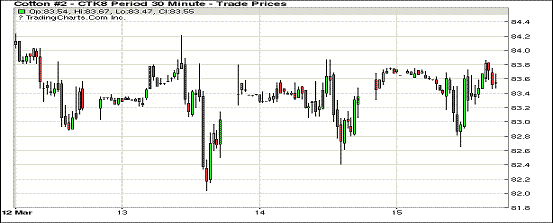 15日紐約期棉市場(chǎng)全面收漲,1805合約結(jié)算價(jià)83.53美分,漲9點(diǎn);1807合約結(jié)算價(jià)83.60美分,漲40點(diǎn);1812合約結(jié)算價(jià)78.19美分,跌17點(diǎn);1903合約結(jié)算價(jià)78.37美分,漲17點(diǎn)。其他合約上漲1-15點(diǎn)不等。當(dāng)日5月合約小幅高開(kāi),開(kāi)盤(pán)后交易圍繞83-83.8美分區(qū)間波動(dòng),美棉出口周報(bào)發(fā)布后賣(mài)盤(pán)入場(chǎng),市場(chǎng)承壓下行短暫跌破83美分,在82.65美分低點(diǎn)處買(mǎi)盤(pán)發(fā)力市場(chǎng)受支撐上行,終小幅收漲。據(jù)美國(guó)農(nóng)業(yè)部(USDA),3.1-3.8日一周美國(guó)凈簽約出口2017/18年度陸地棉72892噸,較前一周減少16%,較近4周平均簽約量減少11%;裝運(yùn)2017/18年度陸地棉93984噸,較前一周減少21%,但較近4周平均增加14%。外圍美元指數(shù)上漲,大豆期貨上漲,玉米和小麥期貨下跌。