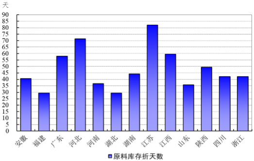 國家棉花市場監(jiān)測系統(tǒng)抽樣調(diào)查顯示,截至3月12日被抽樣調(diào)查企業(yè)棉花平均庫存使用天數(shù)約為46.4天(含到港進口棉數(shù)量),環(huán)比增加4.5天,同比增加12.5天。推算全國棉花工業(yè)庫存約103.8萬噸,環(huán)比增加10.7%,同比增加63.8%(如圖1)。全國主要省份棉花工業(yè)庫存狀況不一,江蘇、河北、江西、廣東省棉花工業(yè)庫存折天數(shù)相對較大(如圖2)。