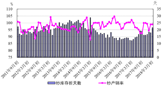 圖7.2011年度以來紗產(chǎn)銷率及庫存折天數(shù)變化情況