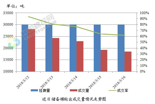 3月16日儲備棉輪出銷售資源30004.679噸,實際成交18470.984噸,成交率61.56%。平均成交價格14374元/噸(較前一日上漲141元/噸);折3128價格15568元/噸(較前一日上漲51元/噸)。