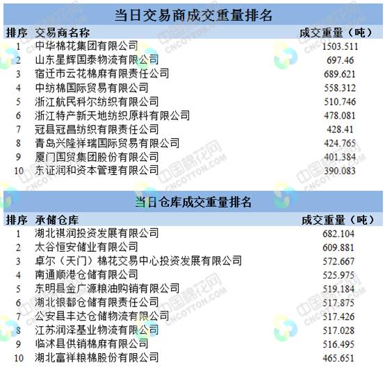 當日地產棉成交5451.515噸,成交率32.10%,成交均價13864元/噸,平均加價188元/噸;新疆棉13019.469噸,成交率100%,成交均價14571元/噸,平均加價570元/噸。