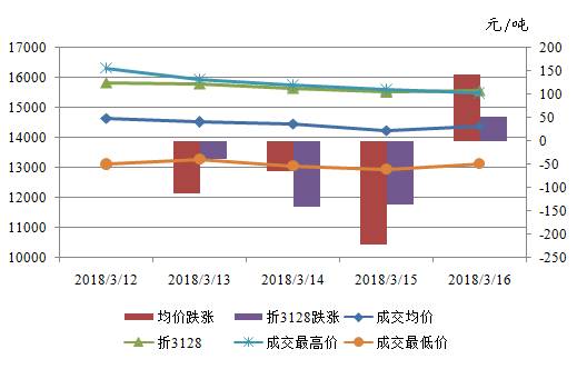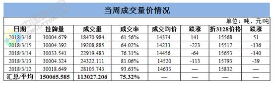 累計情況:截至3月16日,累計計劃出庫15.01萬噸,累計出庫成交11.30萬噸,成交率75.32%;成交平均價14443元/噸,折3128價格15673元/噸,成交最高價16310元/噸,最低價12940元/噸。