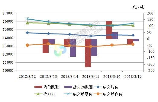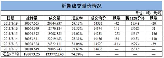 累計(jì)情況:截至3月19日,累計(jì)計(jì)劃出庫(kù)18.01萬(wàn)噸,累計(jì)出庫(kù)成交13.38萬(wàn)噸,成交率為74.29%;成交平均價(jià)格為14442元/噸,折3128價(jià)格15671元/噸,成交最高價(jià)16310元/噸,最低價(jià)12940元/噸。