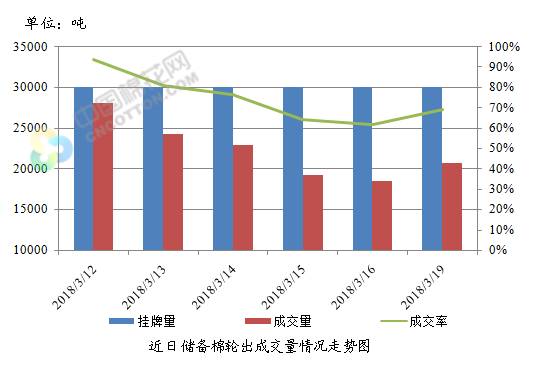 3月19日儲(chǔ)備棉輪出銷售資源30007.665噸,實(shí)際成交20744.937噸,成交率69.13%。平均成交價(jià)格14332元/噸(較前一日下跌42元/噸);折3128價(jià)格15548元/噸(較前一日下跌20元/噸)。