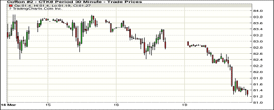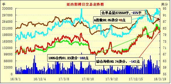 19日紐約期棉市場全面收跌,1805合約結(jié)算價81.23美分,跌162點(diǎn);1807合約結(jié)算價81.52美分,跌146點(diǎn);1812合約結(jié)算價77.29美分,跌99點(diǎn);1903合約結(jié)算價77.50美分,跌97點(diǎn)。其他合約下跌34-86點(diǎn)不等。當(dāng)日5月合約小幅高開,開盤后受賣盤打壓交易重心下行,跌至82.4美分之下后短暫獲得支撐小幅反彈,但受投機(jī)獲利了結(jié)盤打壓跌勢明顯,跌幅加深,最終收于近低點(diǎn)。5月合約和7月合約連續(xù)兩個交易日下跌,分別累計下跌231點(diǎn)和208點(diǎn)。外圍美元指數(shù)下跌,大豆、玉米和小麥期貨下跌。