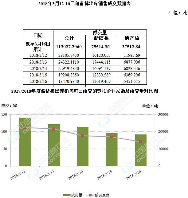 上周(2018年3月12-16日),2017/18年度儲備棉輪出啟動,計劃出庫銷售儲備棉15萬噸,實際成交11.3萬噸,成交率75.32%,其中新疆棉成交7.55萬噸,成交率100%,地產(chǎn)棉成交3.75萬噸,成交率51.8%;從成交價格看,成交平均價格14443元/噸,折標準級(3128)價格15673元/噸,新疆棉成交均價14734元/噸,地產(chǎn)棉成交均價13871元/噸;從成交企業(yè)看,共284家企業(yè)參與競拍,19家企業(yè)成交1000噸以上,其中紡企9家,貿(mào)易商10家。
