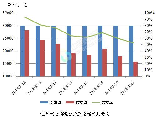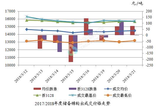 3月21日儲備棉輪出銷售資源30022.027噸,實(shí)際成交15792.566噸,成交率52.60%。平均成交價(jià)格14485元/噸(較前一日上漲78元/噸);折3128價(jià)格15667元/噸(較前一日下跌3元/噸)。