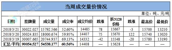 累計(jì)情況:截至3月21日,累計(jì)計(jì)劃出庫24.01萬噸,累計(jì)出庫成交16.76萬噸,成交率69.78%;成交平均價(jià)格14430元/噸,折3128價(jià)格15656元/噸,成交最高價(jià)16310元/噸,最低價(jià)12940元/噸。