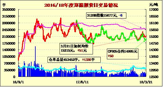 21日隔夜鄭棉盤整后沖高,今日盤中高位震蕩,日線形成陽線。日內(nèi)成交量變化不大,持倉量減少?;久媲闆r:棉花市場呈現(xiàn)調(diào)整觀望,報價基本維持,疆棉手摘3128級強(qiáng)度27級山東庫報價在15600-15650元/噸公定,長絨棉市場相對維持穩(wěn)定,局部價格微漲,成交一般,137級到廠價維持在25200元/噸左右,136級至24800元到廠。而市場多將部分精力集中在儲備棉輪出,部分貿(mào)易商拋儲疆棉河北庫轉(zhuǎn)售報價在15100-15500元/噸,商談不多。傳今年儲備棉出庫費用或相對較高。進(jìn)口棉市場觀望出貨為主,澳棉SM 1-5/32南通庫報價在17800元/噸,巴西棉青島庫M 1-1/8報價在16500元/噸,商談優(yōu)惠。