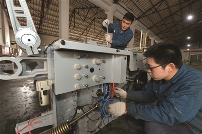曾經(jīng)專業(yè)制造噴水織機(jī)的金斯達(dá)紡織機(jī)械公司,通過技術(shù)創(chuàng)新,將噴水織機(jī)變成不再排放一滴污水的噴氣織機(jī),被紡織界傳為“奇跡”。到3月20日,金斯達(dá)的“水改氣”織機(jī)訂單已經(jīng)排到6月底,目前金斯達(dá)交付和接近交付的噴氣織機(jī)近800臺。圖為工人們在金斯達(dá)位于平望鎮(zhèn)的車間加班加點(diǎn)趕制織機(jī)。