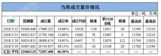 累計情況:截至3月22日,累計計劃出庫27.01萬噸,累計出庫成交18.55萬噸,成交率68.68%;成交平均價格14431元/噸,折3128價格15665元/噸,成交最高價16310元/噸,最低價12940元/噸,累計成交企業(yè)家數(shù)339家。
