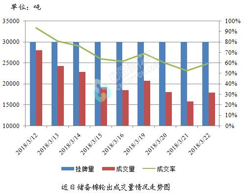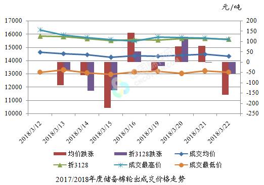 3月22日儲備棉輪出銷售資源30008.666噸,實際成交17969.321噸,成交率59.88%。平均成交價格14326元/噸(較前一日下跌159元/噸);折3128價格15611元/噸(較前一日下跌56元/噸)。