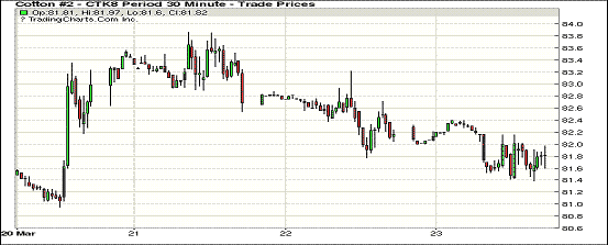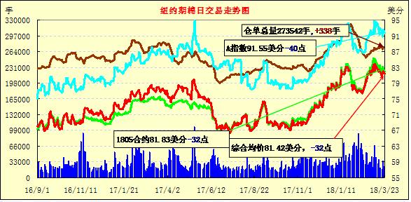 23日紐約期棉市場整體收跌,1805合約結(jié)算價81.83美分,跌32點;1807合約結(jié)算價82.22美分,跌18點;1812合約結(jié)算價77.66美分,跌29點;1903合約結(jié)算價77.85美分,跌28點。當日5月合約小幅高開,開盤后受支撐上行至當日高點82.39美分,后賣盤入場市場承壓下行,跌破82美分后低點處買盤發(fā)力交易重心走高,該合約幾次試圖穩(wěn)定在82美分之上失敗,因上漲動力不足最終小幅收跌。據(jù)美國農(nóng)業(yè)部(USDA),3.8-3.15日一周美國凈簽約出口2017/18年度陸地棉76748噸(含新簽約80082噸,另取消3334噸前期訂單),較前一周增加5%,但較近4周平均簽約量減少3%;裝運2017/18年度陸地棉96411噸,較前一周增加3%,較近4周平均增加10%。外圍美元指數(shù)下跌,大豆期貨下跌,玉米和小麥期貨上漲。