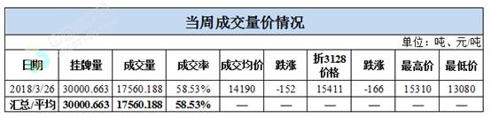 累計情況:截至3月26日,累計計劃出庫33萬噸,累計出庫成交21.91萬噸,成交率為66.35%;成交最高價16310元/噸,最低價12940元/噸。