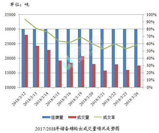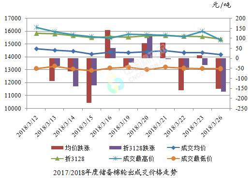 3月26日儲備棉輪出銷售資源30000.663噸,實際成交17560.188噸,成交率58.53%。平均成交價格14190元/噸(較前一日下跌152元/噸);折3128價格15411元/噸(較前一日下跌166元/噸)?!?/p>