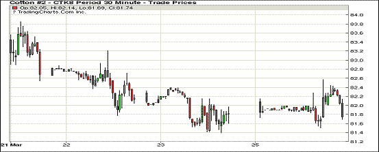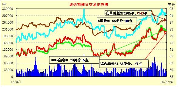 26日1805合約結(jié)算價81.78美分,跌5點(diǎn);1807合約結(jié)算價82.22美分,不變;1812合約結(jié)算價77.70美分,漲4點(diǎn);1903合約結(jié)算價77.88美分,漲3點(diǎn)。當(dāng)日5月合約小幅高開,開盤后在81.80-82美分之間窄幅波動,后受支撐上行,高點(diǎn)處賣盤入場市場被打壓,一路向下跌至當(dāng)日低點(diǎn)81.50美分,于低點(diǎn)處買盤發(fā)力,交易重心迅速走高,至當(dāng)日高點(diǎn)82.57美分處受獲利了結(jié)盤打壓走低,最終小幅收跌。1805合約連續(xù)第四個交易日收跌,累計下跌130點(diǎn)。本周四29日美國農(nóng)業(yè)部將發(fā)布?xì)庑履甓戎裁抟庀蛘{(diào)查,市場普遍關(guān)注。外圍美元指數(shù)下跌,大豆、玉米和小麥期貨下跌。
