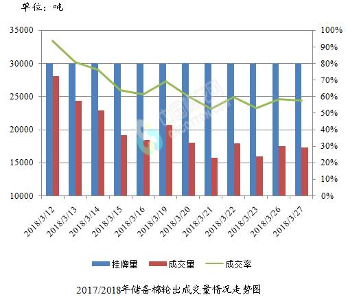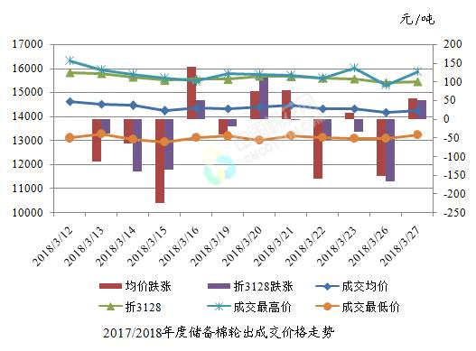 3月27日儲備棉輪出銷售資源30000.277噸,實際成交17300.906噸,成交率57.67%。平均成交價格14245元/噸(較前一日上漲55元/噸);折3128價格15461元/噸(較前一日上漲50元/噸)。