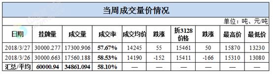 累計情況:截至3月27日,累計計劃出庫36萬噸,累計出庫成交23.64萬噸,成交率為65.63%;成交最高價16310元/噸,最低價12940元/噸。