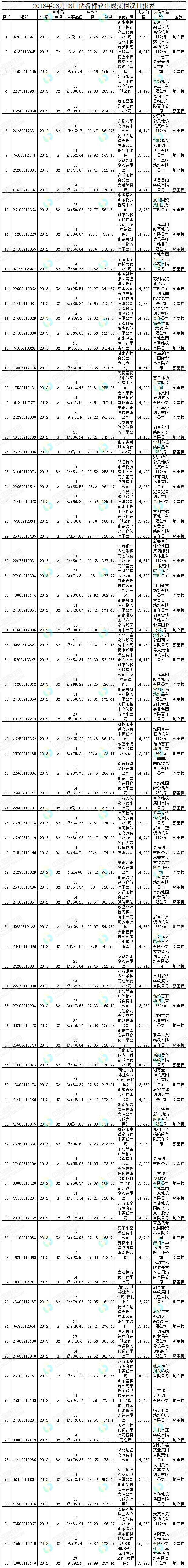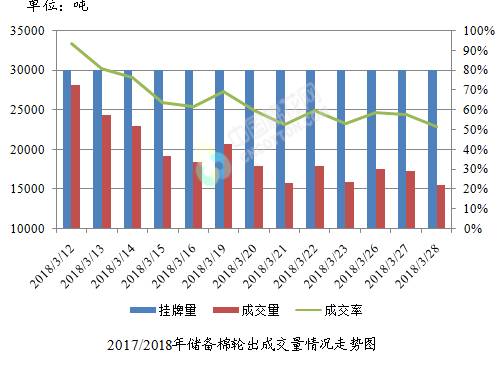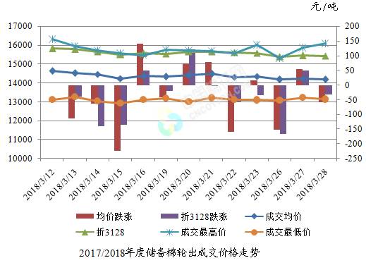 3月28日儲備棉輪出銷售資源30002.769噸,實際成交15551.09噸,成交率51.83%。平均成交價格14187元/噸(較前一日下跌58元/噸);折3128價格15430元/噸(較前一日下跌31元/噸)。