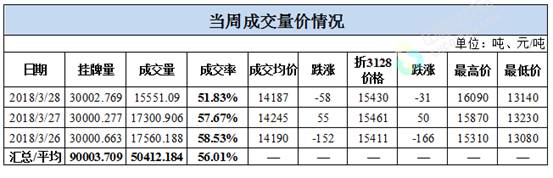 累計情況:截至3月28日,累計計劃出庫39.01萬噸,累計出庫成交25.19萬噸,成交率為64.57%;成交最高價16310元/噸,最低價12940元/噸。