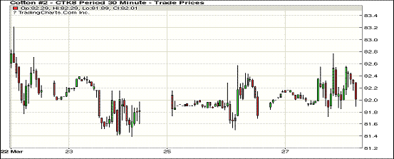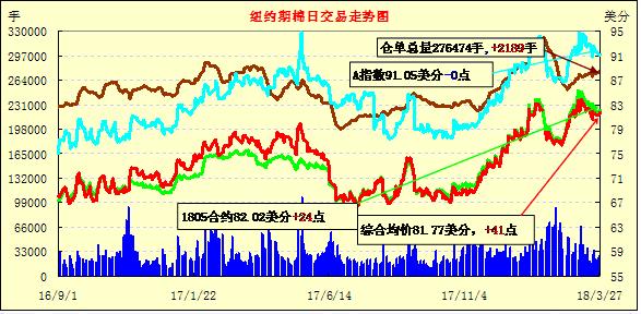 27日紐約期棉市場近漲遠(yuǎn)跌。1805合約結(jié)算價82.02美分,漲24點;1807合約結(jié)算價82.44美分,漲22點;1812合約結(jié)算價77.62美分,跌8點;1903合約結(jié)算價77.80美分,跌8點。當(dāng)日5月合約小幅高開,開盤后在81.80-82.20美分區(qū)間震蕩運行,后受支撐交易重心上行,至82.50美分處賣盤入場市場被打壓,一路向下跌至當(dāng)日低點81.72美分,于低點處買盤發(fā)力,市場飆升至當(dāng)日高點,后受獲利了結(jié)盤打壓回落,最終以小幅上漲收盤。1805合約結(jié)束連續(xù)四日跌勢。美國德州天氣引發(fā)市場持續(xù)關(guān)注,目前西德州旱情持續(xù),且近期尚無降雨預(yù)報。外圍美元指數(shù)上漲,玉米期貨上漲,大豆和小麥期貨下跌。