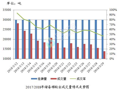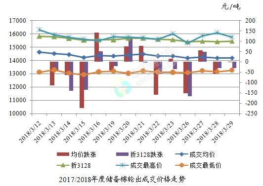 3月29日儲備棉輪出銷售資源30000.335噸,實(shí)際成交13878.114噸,成交率46.26%。平均成交價(jià)格14189元/噸(較前一日上漲2元/噸);折3128價(jià)格15452元/噸(較前一日上漲22元/噸)。