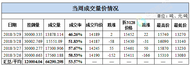 累計(jì)情況:截至3月29日,累計(jì)計(jì)劃出庫42.01萬噸,累計(jì)出庫成交26.58萬噸,成交率為63.26%;成交最高價(jià)16310元/噸,最低價(jià)12940元/噸。