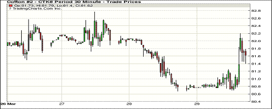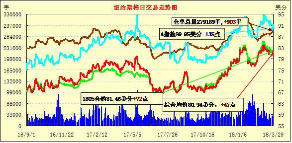 29日為紐約三月份最后一個交易日。1805合約結算價81.46美分,漲72點;1807合約結算價81.80美分,漲62點;1812合約結算價77.73美分,漲74點;1903合約結算價77.82美分,漲59點。當日5月合約穩(wěn)定開盤,開盤后在圍繞80.8美分一線窄幅震蕩運行,在美棉出口周報發(fā)布前,市場小幅走高,在報告發(fā)布后不敵賣盤壓力回落,午后USDA發(fā)布新年度意向種植預期報告,市場受提振躥高,至當日高點82.20美分處賣盤入場,承壓走低,最終小幅收漲。據美國農業(yè)部3月份意向種植預期報告,2018/19年度美棉種植面積1346.9萬英畝,較本年度增6.8%。其中陸地棉面積1320.7萬英畝,同比增6.9%;皮馬棉26.2萬英畝,同比增4.2%。據美國農業(yè)部(USDA),3.15-3.22日一周美國凈簽約出口2017/18年度陸地棉69014噸;裝運2017/18年度陸地棉99428噸。凈簽約出口2018/19年度陸地棉14084噸。30日為公共假期,紐約期棉將休市一天。外圍美元指數上漲,玉米、大豆和小麥期貨上漲。