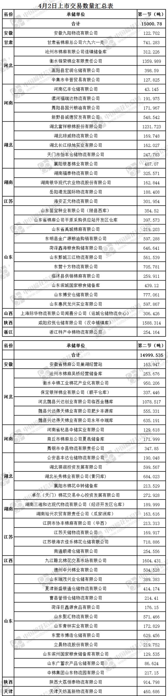 4月2日兩節(jié)共計(jì)輪出儲(chǔ)備棉30000.315噸。第一節(jié)銷(xiāo)售儲(chǔ)備棉15000.78噸,其中需要倒垛出庫(kù)78捆。第二節(jié)銷(xiāo)售儲(chǔ)備棉14999.535噸,其中需要倒垛出庫(kù)77捆。