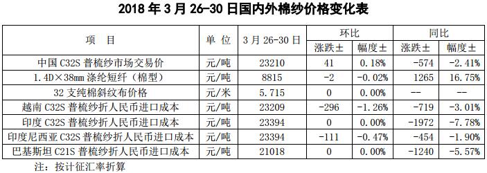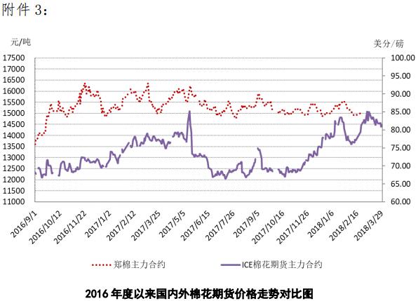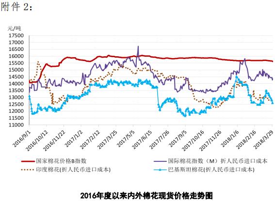 本周,市場對(duì)貿(mào)易戰(zhàn)擔(dān)憂好轉(zhuǎn),全球股市跌勢放緩,國際棉價(jià)跌幅收窄。3月26-30日紐約棉花期貨主力合約結(jié)算價(jià)81.5美分/磅,較上周下跌0.68美分/磅,跌幅0.82%;代表進(jìn)口棉中國主港到岸均價(jià)的國際棉花指數(shù)(M)為89.42美分/磅,較上周下跌0.92美分/磅,跌幅1.02%,折人民幣進(jìn)口成本14388元/噸(按計(jì)征匯率折算,下同),較上周下跌144元/噸,跌幅0.99%,低于國內(nèi)市場1258元/噸,內(nèi)外棉價(jià)差較上周擴(kuò)大119元/噸(詳見附件1)。