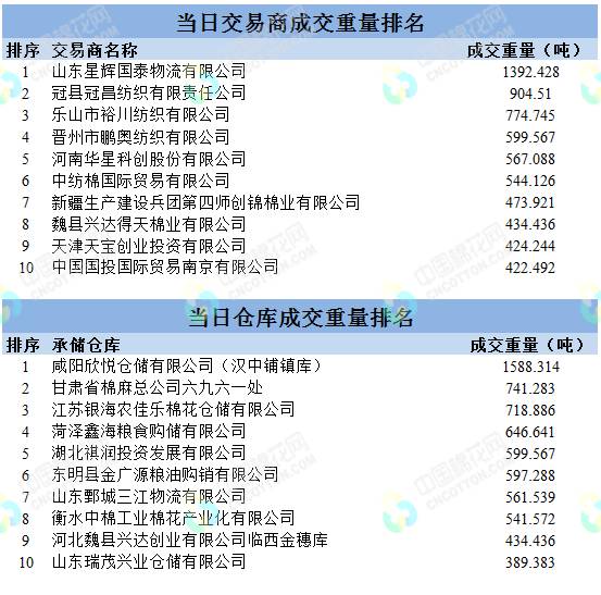 地產(chǎn)棉成交4375.096噸,成交率22.65%,成交均價(jià)13616元/噸,平均加價(jià)128元/噸,最高成交價(jià)14500元/噸,最低成交價(jià)12990元/噸;新疆棉成交10680.096噸,成交率100%,成交均價(jià)14410元/噸,平均加價(jià)712元/噸,最高成交價(jià)15420元/噸,最低成交價(jià)13640元/噸。