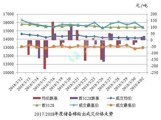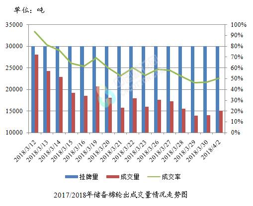 4月2日儲(chǔ)備棉輪出銷售資源30000.315噸,實(shí)際成交15055.192噸,成交率50.18%。平均成交價(jià)格14179元/噸(較前一日上漲26元/噸);折3128價(jià)格15464元/噸(較前一日上漲32元/噸)。